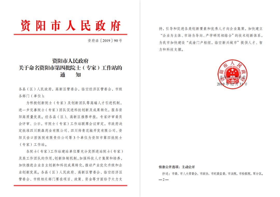 最終,經(jīng)各縣(區)、高新區推薦申報,專(zhuān)家評審委員會(huì )評審、公示,市院士(專(zhuān)家)工作站聯(lián)席會(huì )議審定,市政府決定批準四川默森藥業(yè)有限公司等 3 個(gè)單位為資陽(yáng)市第四批院士(專(zhuān)家)工作站。